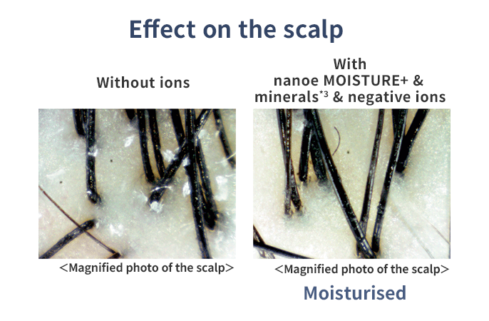 Improving scalp health is the first step towards beautiful hair. Moisture is added by water-rich 「nanoe MOISTURE+」 & minerals*3 & negative ions to prevent the dryness that can cause scalp stress. This also makes it easier for excess scalp sebum to blend with peripheral moisture and maintain a healthy scalp.