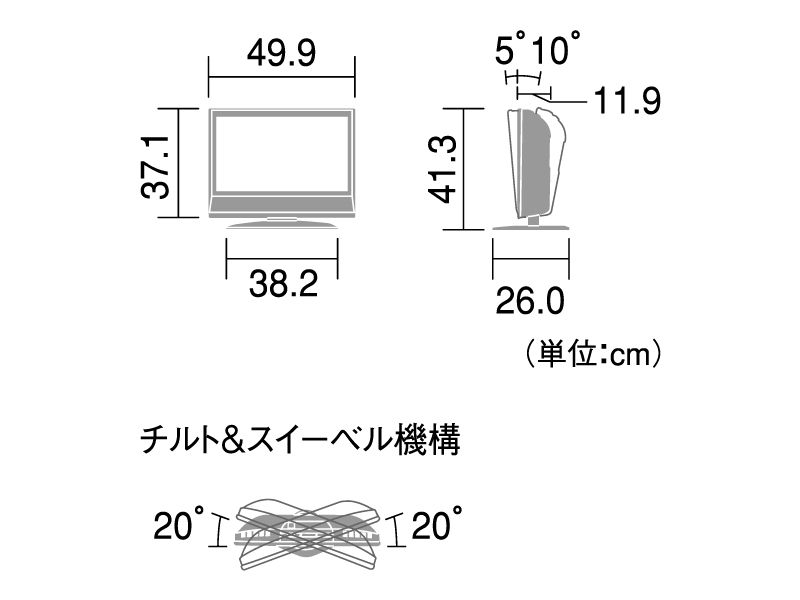 | 角度調節範囲(テレビスタンド) | 約10°(上向き)、約5°(下向き)、約20°(左右) | |