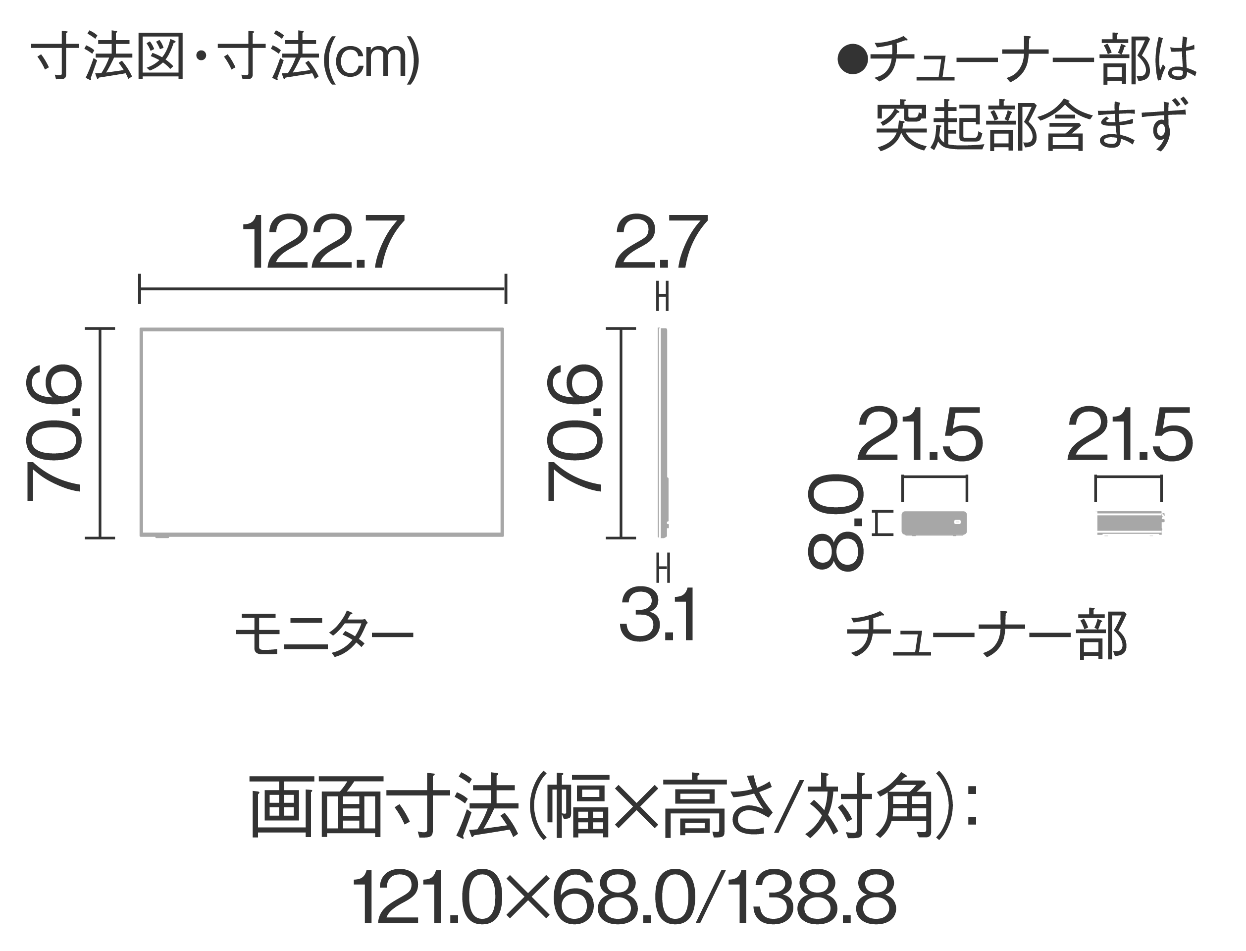 | 外形寸法 | (モニター) 幅:1227mm 高さ:706mm 奥行:31/27mm(突起部含む/含まず) (チューナー部) 幅:215mm 高さ:80mm 奥行:226/215mm(突起部含む/含まず) |